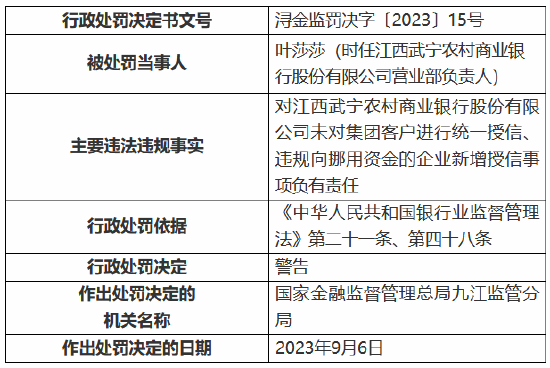 其员工叶莎莎对江西武宁农村商业银行股份有限公司未对集团客户进行统一授信、违规向挪用资金的企业新增授信事项负有责任,被处以警告。