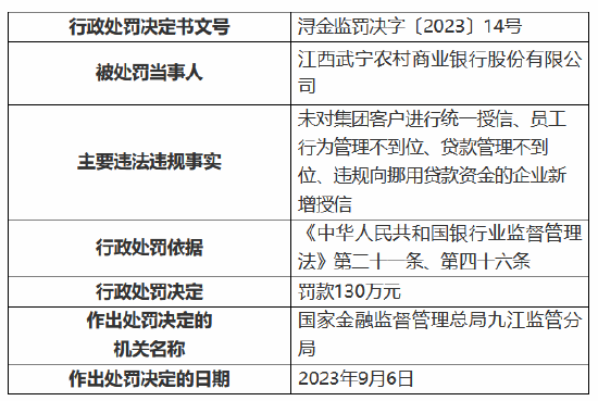 9月15日金融一线消息,国家金融监督管理总局九江监管分局行政处罚信息公开表显示,江西武宁农村商业银行股份有限公司未对集团客户进行统一授信、员工行为管理不到位、贷款管理不到位、违规向挪用贷款资金的企业新增授信,被罚款130万元。