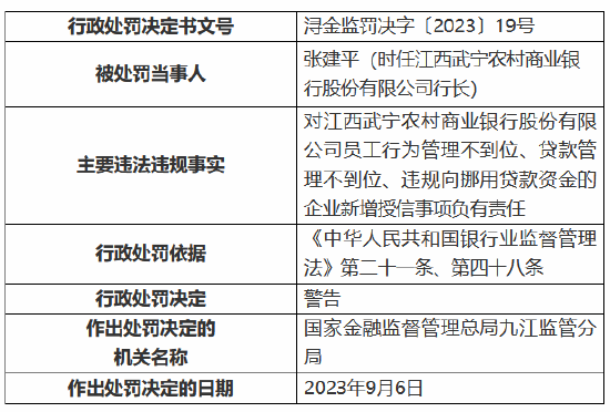 其员工张建平对江西武宁农村商业银行股份有限公司员工行为管理不到位、贷款管理不到位、违规向挪用贷款资金的企业新增授信事项负有责任,被处以警告。