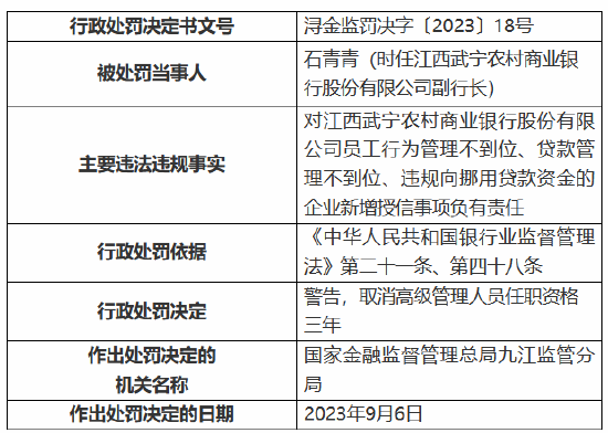 其员工石青青对江西武宁农村商业银行股份有限公司员工行为管理不到位、贷款管理不到位、违规向挪用贷款资金的企业新增授信事项负有责任,被处以警告,并取消高级管理人员任职资格三年。