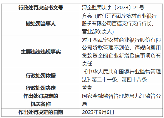其员工方亮对江西武宁农村商业银行股份有限公司贷款管理不到位、违规向挪用贷款资金的企业新增授信事项负有责任,被处以警告。