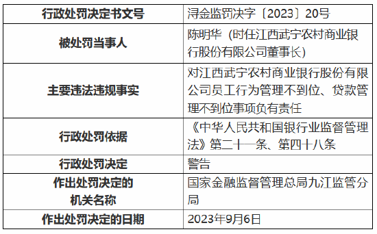 其员工陈明华对江西武宁农村商业银行股份有限公司员工行为管理不到位、贷款管理不到位事项负有责任,被处以警告。