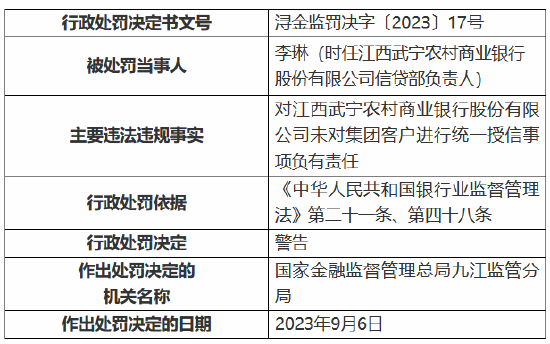 其员工魏倩倩、李琳对江西武宁农村商业银行股份有限公司未对集团客户进行统一授信事项负有责任,被处以警告。