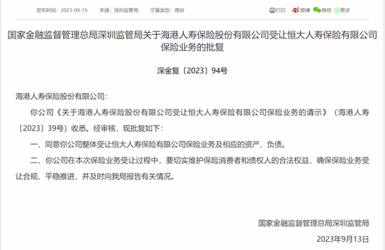 同日,国家金融监督管理总局深圳监管局发布关于海港人寿保险股份有限公司受让恒大人寿保险有限公司(简称“恒大人寿”)保险业务的批复,同意海港人寿整体受让恒大人寿保险业务及相应的资产、负债,批复日期为9月13日。
