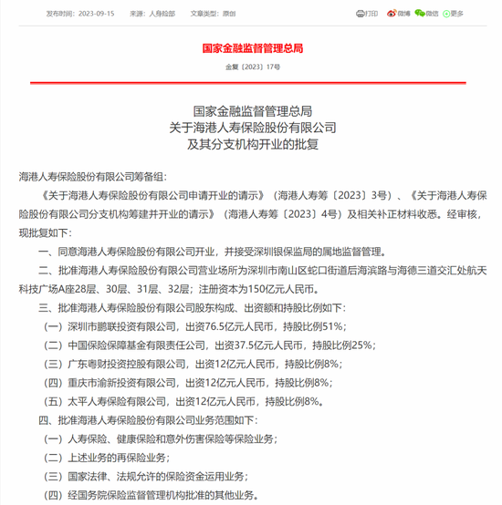 9月15日,国家金融监督管理总局发布关于海港人寿保险股份有限公司(简称“海港人寿”)及其分支机构开业的批复,批复日期为6月1日。