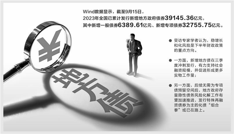 受访专家学者认为,稳增长和化风险是下半年财政政策的重点方向。一方面,新增地方债在三季度冲刺发行,有力支持社会融资规模,并促进形成更多实物工作量;另一方面,后续无需为专项债预留空间后,地方政府存量隐性债务风险化解(下称化债)工作有望加速推进,发行特殊再融资债券为主的化债“组合拳”或已在路上。