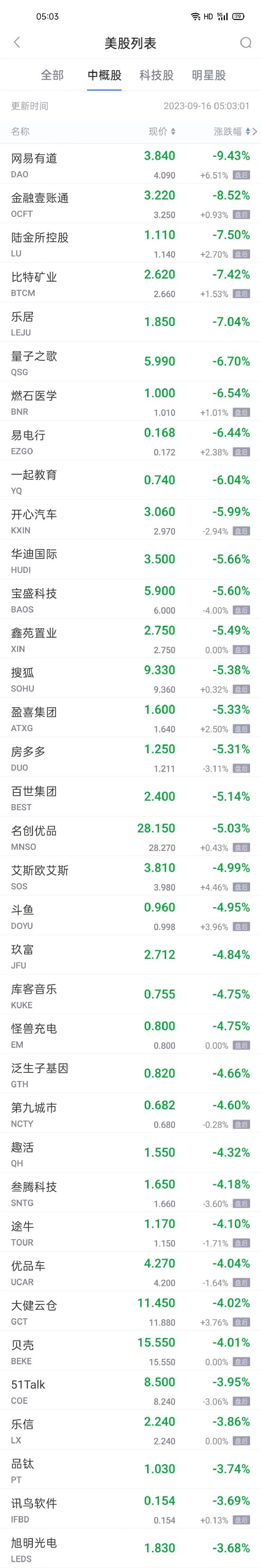 网易有道跌超9%,金融壹帐通跌超8%,陆金所控股、比特数字跌超7%,量子之歌、燃石医学、易电行跌超6%,搜狐、名创优品跌超5%,斗鱼、怪兽充电、途牛、优品车、大健云仓、贝壳跌超4%,乐信、联拓生物、奇景光电、思享无限、中阳金融跌超3%,能链智电、360数科、大全新能源、小i机器人、达达集团、台积电、新东方、叮咚买菜、诺亚财富、小牛电动跌超2%,阿特斯、金山云、晶科能源、老虎证券、唯品会、万物新生、达内科技、万国数据、联电、虎牙、阿里巴巴、百度跌超1%,哔哩哔哩跌近1%。