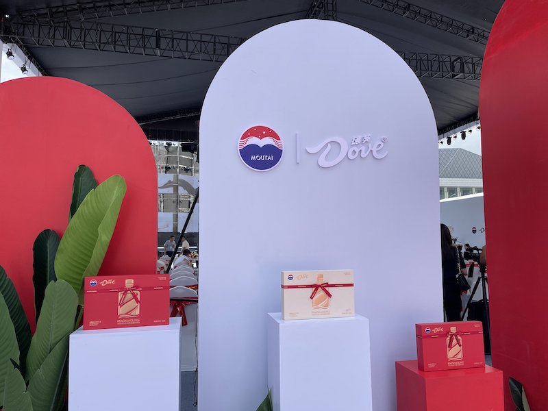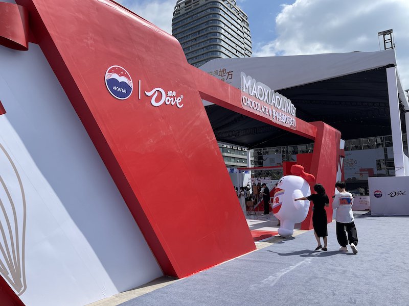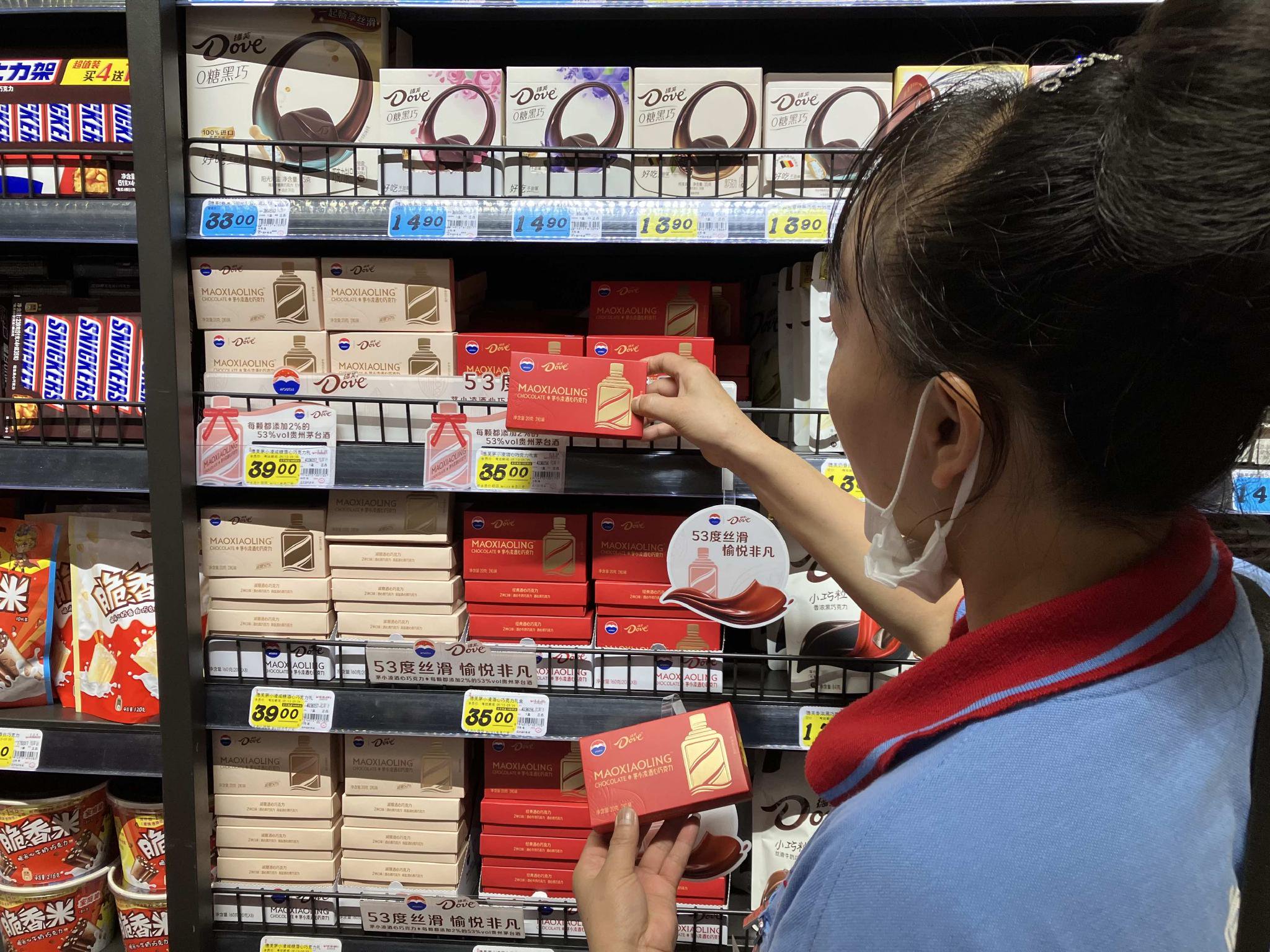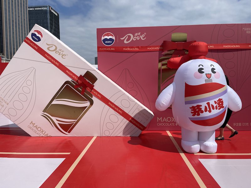 同时在活动现场也有“茅小凌”酒心巧克力的商品,记者亲测了一颗,入口就是德芙巧克力的口感,融化后内部是软心巧克力,具有明显的茅台酒味道。