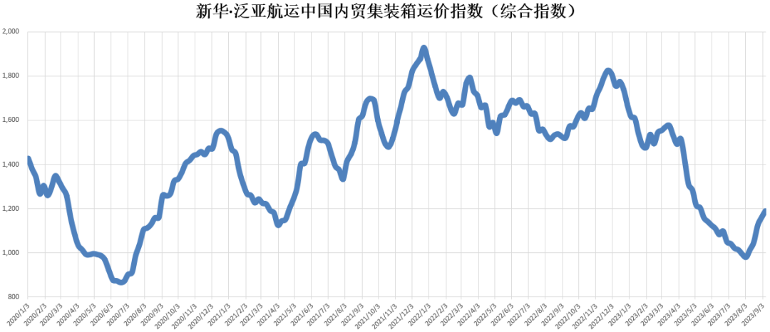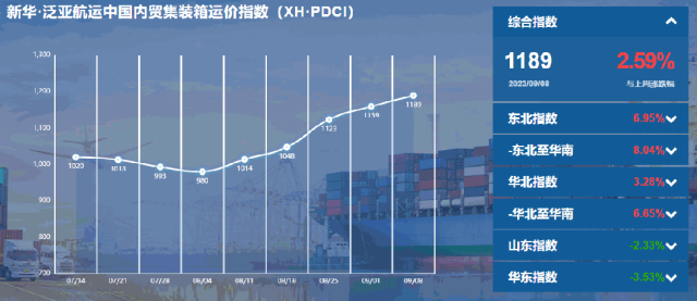 核心提示:本期报告(9月2日至8日),新华·泛亚航运中国内贸集装箱运价指数(XH·PDCI)报1189点,较上期(8月26日至9月1日)环比上涨30点,涨幅2.59%,同比下跌331点,跌幅21.78%;6只区域子指数“三涨三跌”,4只流向子指数“三涨一跌”。