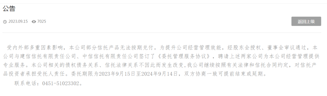 9月16日凌晨,中融信托突然发布公告称,受内外部多重因素影响,本公司部分信托产品无法按期兑付。为提升公司经营管理效能,经股东会授权、董事会审议通过,本公司与建信信托有限责任公司、中信信托有限责任公司签订了《委托管理服务协议》,聘请上述两家公司为本公司经营管理提供专业服务。