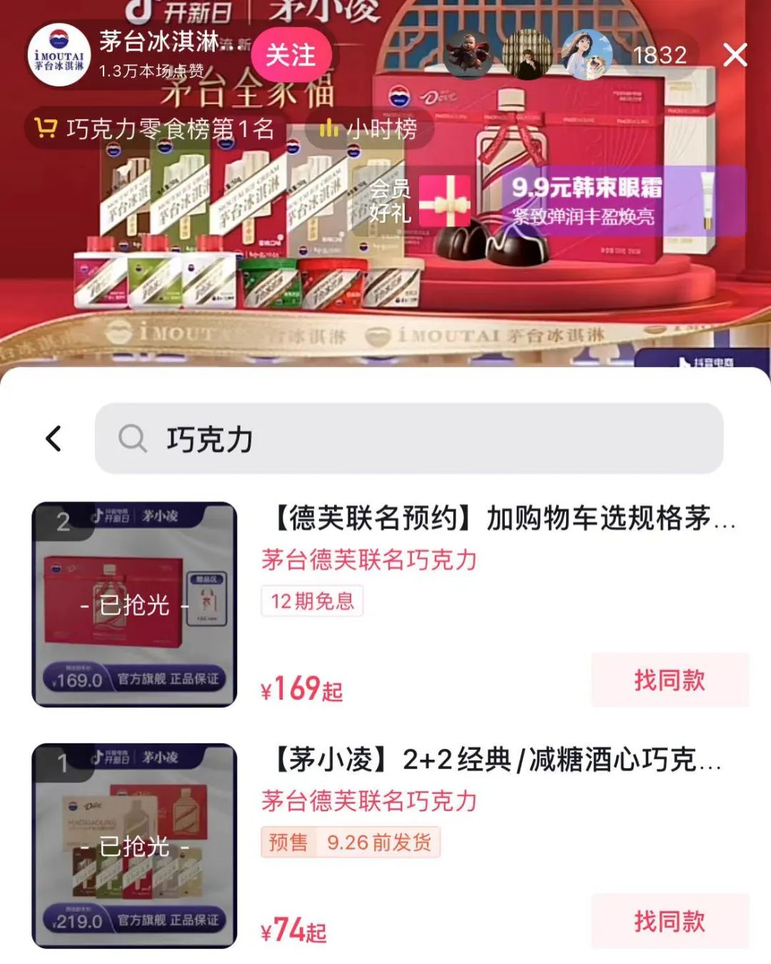 不过,记者查看销售数据,发现该款酒心巧克力线上渠道的产品量并不多。抖音茅台冰淇淋旗舰店上该产品的已售销量显示约有3000,天猫茅台冰淇淋旗舰店上的已售销量显示为400+,德芙天猫旗舰店上的已售销量显示为2000+。