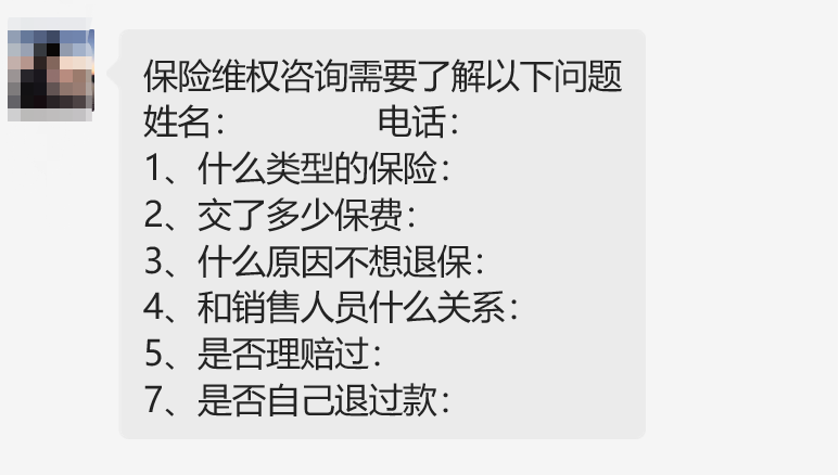 在咨询过程中,多家代理退保机构的工作人员要求记者首先提供一份基本信息,包括姓名、电话、保险类型、购买时间、交费金额、保险业务员情况、退保原因等信息。
