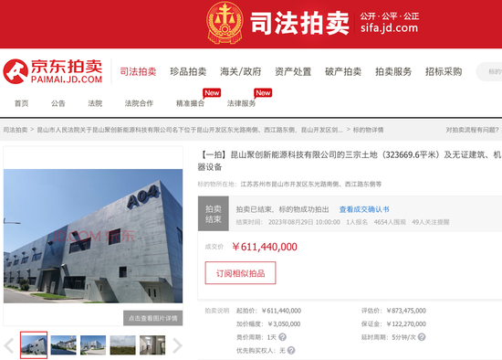 在8月29日,昆山聚创的三宗土地及无证建筑、机器设备,以6.1亿元价格被竞拍,竞拍人为昆山市工业开发投资有限公司。