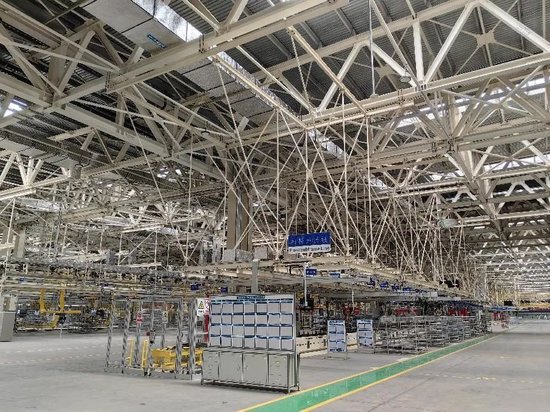 进入总装车间,前桥分装线绵延数百米,一整排生产线装配齐全却没有开工,设备上布满灰尘。