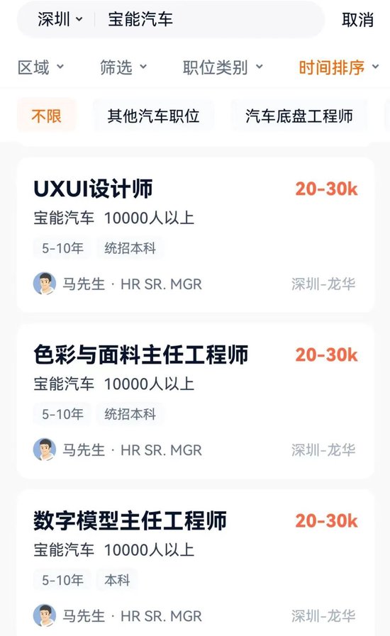 查询某招聘平台可见,宝能汽车在西安、深圳区域,仍有多条招聘信息,岗位包括战略规划经理、大数据开发工程师、自动驾驶产品规划主任、CAN总线测试工程师等。