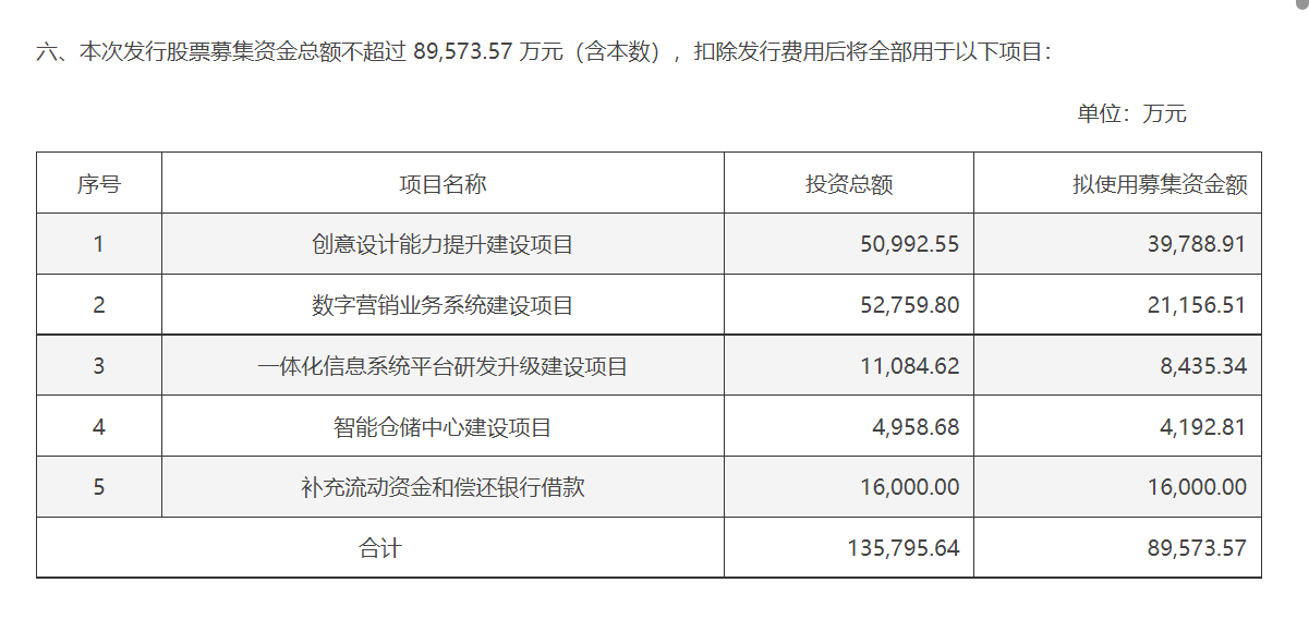 几经修订,2023年7月这笔定增最终获批复。据定增注册稿,募集资金将用于创意设计能力提升建设项目、数字营销业务系统建设项目、一体化信息系统平台研发升级建设项目、智能仓储中心建设项目以及补充流动资金和偿还银行借款。