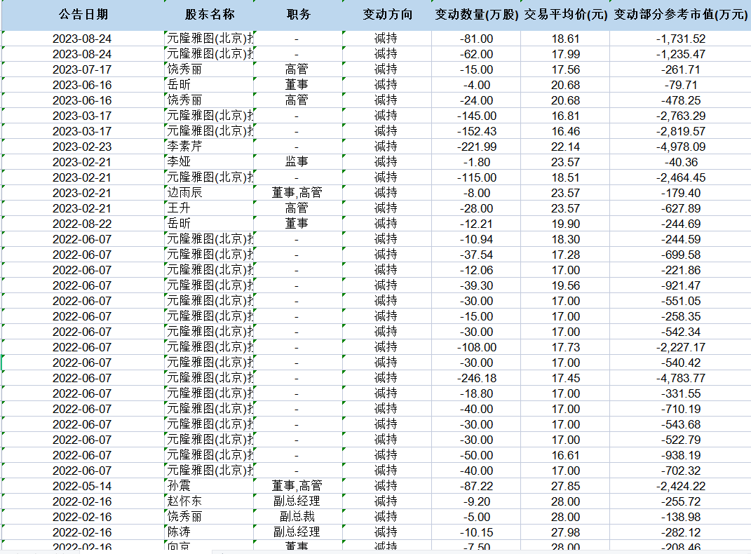 事实上,2022年以来,雅图投资已经完成了多次减持,合计套现金额超过2亿元。2022年1月4日至6月2日,元隆投资通过大宗交易合计减持767.81万股股份;2023年一季度,雅图投资再次通过大宗交易减持近300万股。