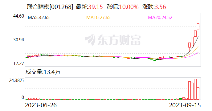二级市场上,截至15日收盘,联合精密涨10.00%,报39.15元/股。