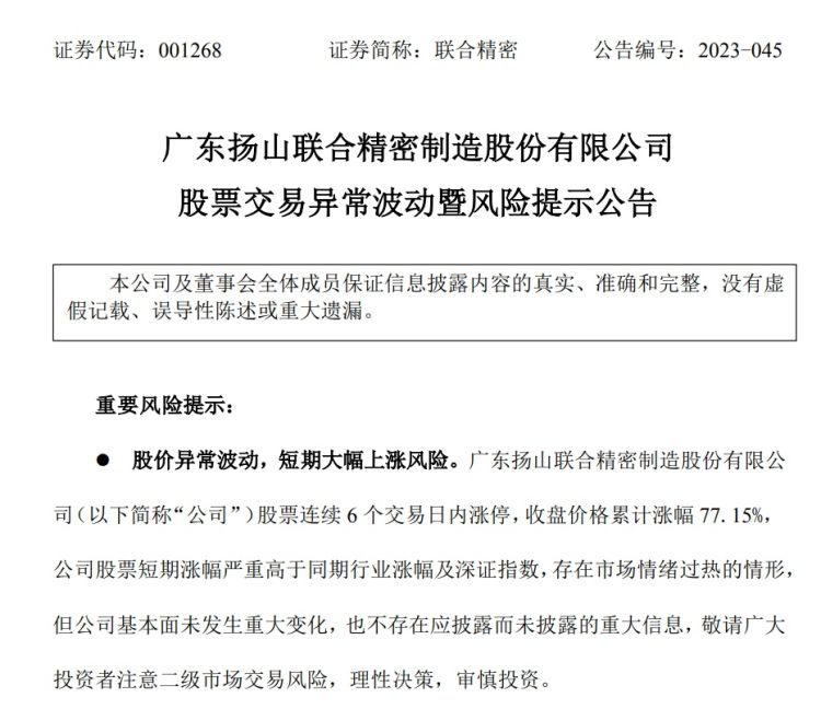 联合精密表示,公司股票连续6个交易日内涨停,收盘价格累计涨幅77.15%,短期涨幅严重高于同期行业涨幅及深证指数,存在市场情绪过热的情形,但公司基本面未发生重大变化,也不存在应披露而未披露的重大信息,敬请广大投资者注意二级市场交易风险,理性决策,审慎投资。