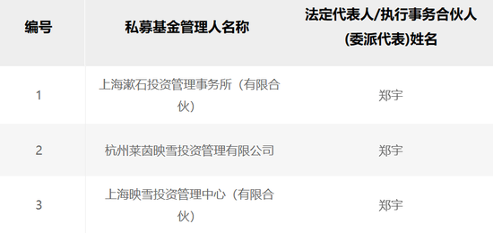 中基协信息还显示,映雪投资、莱茵映雪投资和漱石投资的实控人均为郑宇,而郑宇也在此次被中基协处分的人员中。纪律处分决定书显示,郑宇为映雪投资执行事务合伙人、莱茵映雪投资的法定代表人,漱石投资执行事务合伙人和雪杉基金董事长。