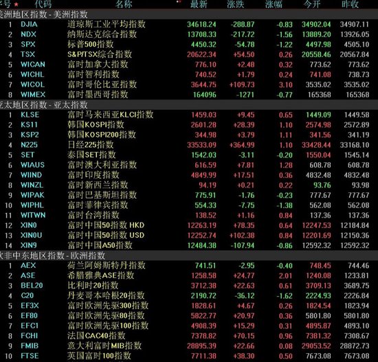 周五,美国三大股指全线收跌,道指跌0.83%报34618.24点,标普500指数跌1.22%报4450.32点,纳指跌1.56%报13708.34点。本周,道指涨0.12%,标普500指数跌0.16%,纳指跌0.39%。