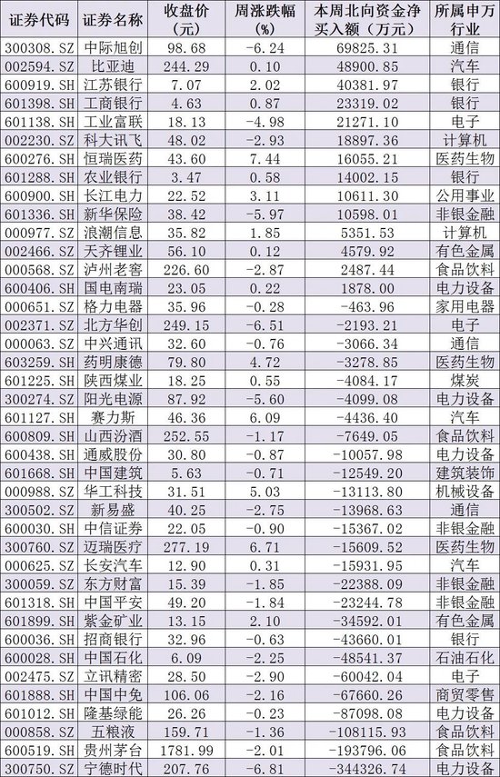 资金方面,本周北向资金累计净卖出金额达152.06亿元。从前十大成交活跃股来看,本周,中际旭创、比亚迪、江苏银行等3只个股,北向资金净买入金额均超4亿元。另外,宁德时代、贵州茅台、五粮液等个股遭北向资金净卖出金额均超10亿元。