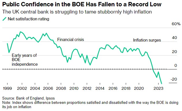 英国央行自己对英国家庭态度的调查显示,在生活成本危机和利率飙升的背景下,公众对英国央行的信心已跌至创纪录低点。