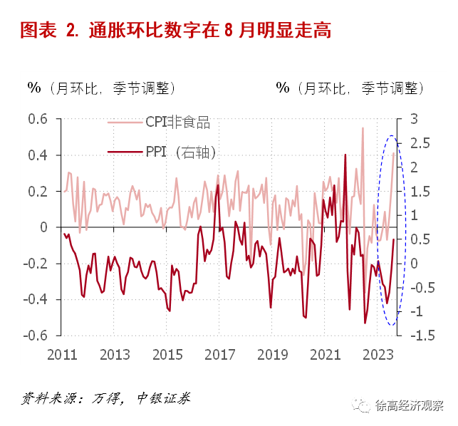 经济增长势头的改善似乎还表现在通胀数字上。8月CPI同比增长率从上月的-0.3%回升至0.1%,同期PPI同比增长率也从上月-4.4%回升至-3.0%。相比反应滞后的同比数字而言,季节调整之后的月环比数字更值得关注。8月,季调之后的CPI非食品价格和PPI价格的月环比均明显走高,一改前几个月低迷的状况,表明通缩压力明显减轻。(图表 2)