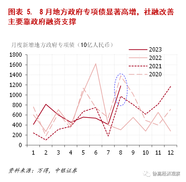 内需改善很大程度上来自专项债的支撑,体现了稳增长政策对经济的托底作用。8月社会融资的增量中,规模接近1.2万亿元的地方政府专项债是个亮点。8月专项债的这一增幅不仅比7月高出了约8千亿元,而且还创出了2022年7月以来的专项债月度增幅的新纪录。在8月专项债高增的同时,实体经济自发融资需求相对低迷。一个证据是8月新增贷款中的“票据融资”增量处在接近3500亿元的高位。商业银行(因为缺乏贷款投向项目)用短期票据冲量的倾向比较明显。(图表 5)