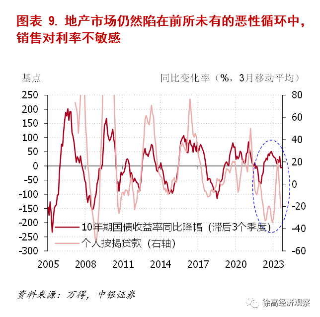 “认房不认贷”政策并未触及当前地产行业主要矛盾,因而难以让地产行业跳出当前的恶性循环。2021年“三条红线”政策推出之后,我国地产行业进入了前所未有的恶性循环。在过去,地产行业对利率相当敏感。在2005至2020年间的6轮地产周期中,每当国内10年期国债收益率同比下降3个季度之后,个人房屋按揭贷款增速就会显著上升。但从2021年到现在,国内10年期国债利率明显下降,个人按揭贷款增速却不增反降,与过去规律形成了明显反差。(图表 9)