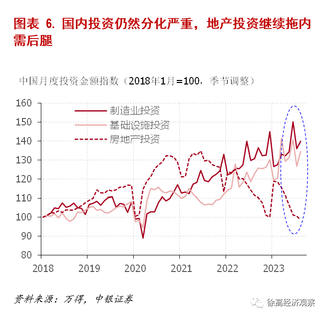 8月国内投资分化程度进一步加大,地产对内需的拖累作用仍然明显。在组成我国总投资的制造业投资、基础设施投资和房地产投资这3大块中,前两者季节调整之后的绝对水平在8月小幅走高,继续延续着上升的趋势。但地产投资绝对水平却继续趋势向下。地产行业仍然是当前宏观经济的主要矛盾和主要风险所在。(图表 6)
