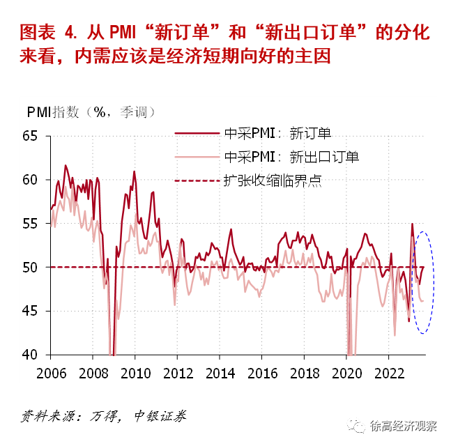 当然,下游需求也并非全无改善。8月制造业PMI中“新订单”指数继续回升,已上升至50%这一扩张收缩临界点附近。但同时,PMI中的“新出口订单”指数仍然处于收缩区间里的低位。在出口订单疲弱的时候总订单却在改善,表明内需是总需求上扬的主要原因。(图表 4)
