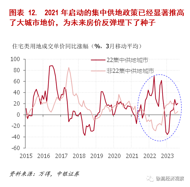 2021年启动的“集中供地”政策也早已为房价上涨埋下了种子。2021年,我国在22个重点城市(主要是一二线大城市)推出了“集中供地”政策,要求这些城市每年只集中供地3次,其他时间不得供地。这个政策的初衷应该是要试图控制地价和房价,但由于它加强了土地供应的垄断程度,势必反而推高地价房价。2021年集中供地政策推出之后,涉及到的22个城市的住宅类用地成交单价显著上涨,与其他城市地价走势明显背离。2023年8月,22个集中供地城市的住宅类用地成交单价,相比2021年6月末水平上涨了约50%,而同期其他城市住宅类用地成交单价却下降了30%——集中供地政策推升地价的效果可见一斑。2022年以来,部分城市集中供地政策虽有所放松,但集中供地政策的整体调子仍然延续。在集中供地政策已显著推升大城市地价的时候,房价更容易在地产需求刺激政策作用下显著上升。(图表 12)