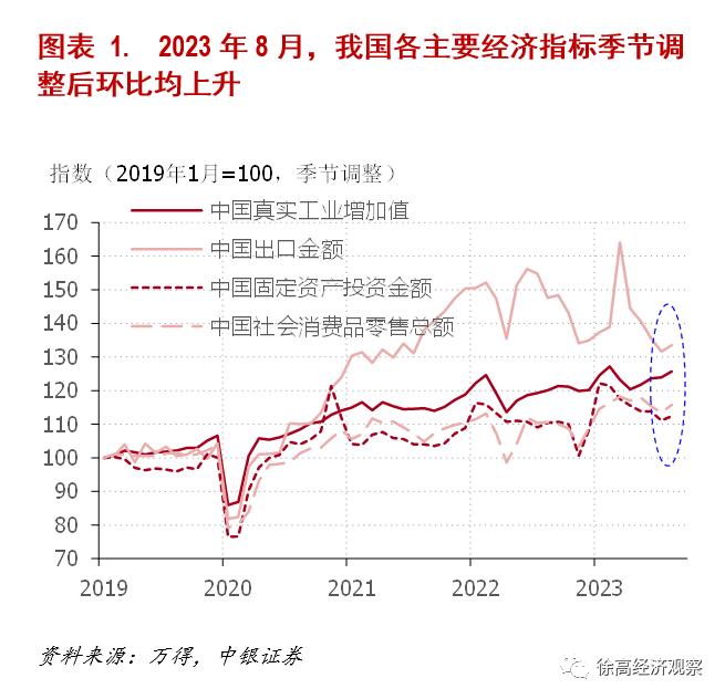 近期发布的2023年8月经济数据显示,我国经济增长势头改善,环比增速拐头向上。季节调整之后,需求面的出口金额、固定资产投资金额、社会消费品零售金额,以及供给面的实际工业增加值,他们的绝对水平均回升(环比正增长),扭转了过去几个月绝对水平持续下滑的趋势。(图表 1)