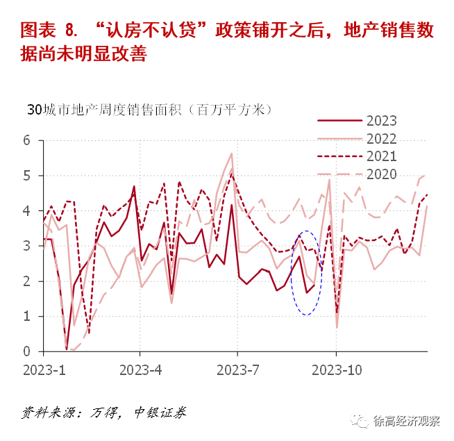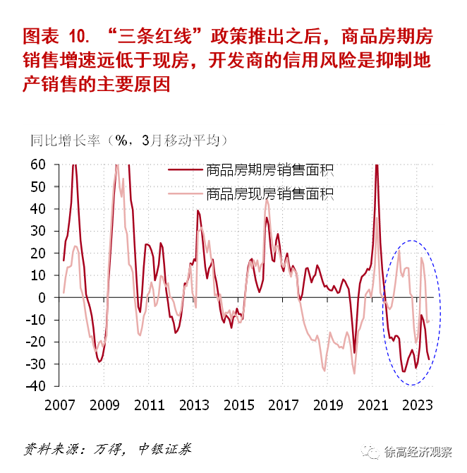 造成个人按揭贷款增速与国债利率走势背离的关键原因,是地产开发商高企的信用风险。当地产开发商资金链紧张,信用风险高企的时候,银行会有“惜贷”情绪,因为担心坏账风险也不愿给地产开发商放贷款。同时,购房者也有“惜购”情绪,担心房子烂尾没法交付而不敢买期房。自2021年“三条红线”政策推出以来,国内商品房期房销售面积增速持续显著低于现房销售面积增速,充分表现了老百姓对期房能否交付的担忧。而银行“惜贷”和老百姓“惜购”,反过来又会让地产开发商资金链更紧张,信用风险更高,进而助长“惜贷”和“惜购”的情绪。这是一个已经成型的自我强化的恶性循环。放松地产限购的“认房不认贷”政策并未触及这个恶性循环形成的核心原因——开发商的信用风险——因而也就难以打破这个恶性循环。(图表 10)