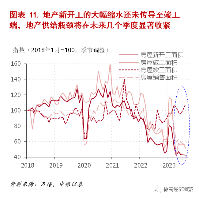 由于未能抓住开发商信用风险高企这个主要矛盾,地产需求面的放松政策难以修复地产行业,倒越来越会让房价成为一个问题。相比2020年末“三条红线”政策尚未推出之时,当前我国房屋新开工面积和施工面积已经下降了约2/3,房屋销售面积下降了约1/2。只有房屋竣工面积,当前甚至还略高于2020年末的水平。这主要是因为在过去两年,地产开发商加速推盘,以加快回笼销售款。但这样的加速推盘是在挖在建面积的存量,势难持续。考虑到地产项目建设周期大概也就是两年,在未来几个季度,当前低迷的房屋新开工和施工面积将向竣工面积传导,在竣工端的地产供给将显著收紧。因此,虽然当前地产现房市场上主要还是供大于需(销售面积相比2020年末跌了约1/2,同时竣工面积没怎么降),但考虑到需求端的刺激政策,以及供给端竣工面积即将到来的大幅缩水,地产供需形势会很快逆转为供不应求的状况,从而给房价带来巨大上涨压力。(图表 11)