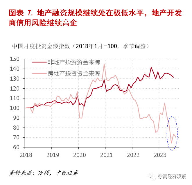 当前地产行业的真正风险在地产开发商的信用风险。自从2021年针对地产融资的“三条红线”政策推出以来,地产行业融资就显著收缩。目前地产行业融资绝对水平大概只有“三条红线”政策推出之前的一半。可以说,地产开发商作为一个整体,普遍面临资金链紧绷,信用风险高企的状况。地产开发商群体爆发系统性危机的可能性不低。(图表 7)