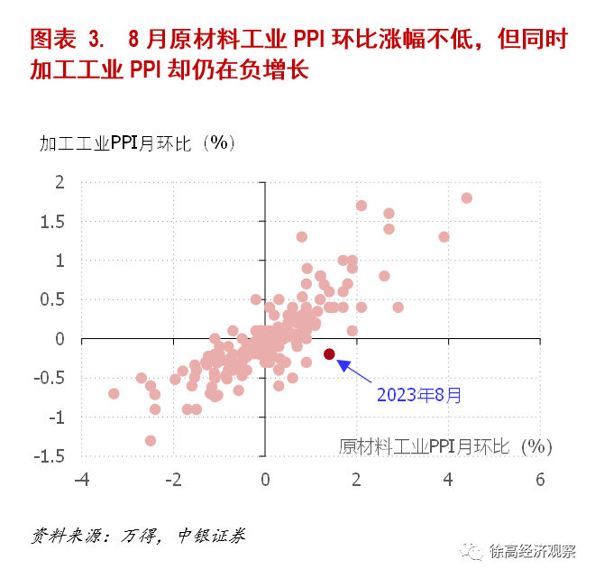 通胀回升很大程度上来自上游供给瓶颈收紧带来的上游价格上涨。8月CPI环比上涨的三个主要贡献项是猪肉、蛋类,以及车用燃料(石油)。而在PPI分项中,8月上游原材料工业月环比涨幅从上月的-0.4%上升至1.4%,而下游的加工工业PPI月环比涨幅则只有-0.2%,仅比上月涨幅高了0.2个百分点。相比历史规律,当前下游价格改善的程度明显弱于上游。这说明,通胀改善更多来自上游而非下游,上游供给收紧的影响大于下游需求改善的影响。(图表 3)