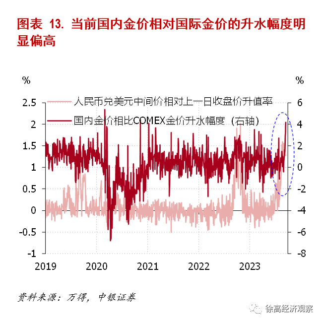 黄金作为价值密度高,易于携带的物品,其国内外价格一般相差不大。过去3年,用人民币即期汇率计算,我国国内黄金期货价格相比纽约商品交易所(COMEX)的黄金期货价格平均升水0.4%——国内金价比纽约金价平均高0.4%。但在2023年9月15日,国内金价相比纽约金价的升水幅度已经上升至4.2%,创出两年新高。这表明,虽然在外汇市场上因为央行的调控,人民币没法对美元贬值到位,但在相对黄金时,人民币却贬出了更多的幅度,反映了市场中人民币的潜在贬值压力。从当前金价升水幅度与过去3年平均升水幅度的对比来估算,如果央行不动用逆周期调节因子,人民币兑美元汇率恐怕要在现在水平上再贬值3.8%。(图表 13)