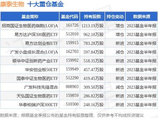 根据2023基金半年报公募基金重仓股数据,重仓该股的公募基金共244家,其中持有数量最多的公募基金为招商国证生物医药指数(LOF)A。招商国证生物医药指数(LOF)A目前规模为107.5亿元,最新净值0.4818(9月15日),较上一交易日上涨1.88%,近一年下跌18.19%。该公募基金现任基金经理为侯昊 许荣漫。侯昊在任的基金产品包括:招商中证白酒指数(LOF)A,管理时间为2017年8月22日至今,期间收益率为203.02%;招商大宗商品(LOF),管理时间为2017年9月5日至今,期间收益率为20.44%;招商中证银行指数A,管理时间为2017年9月5日至今,期间收益率为22.51%;招商中证煤炭等权指数(LOF)A,管理时间为2017年9月5日至今,期间收益率为44.94%。许荣漫在任的基金产品包括:招商上证消费80ETF联接A,管理时间为2021年4月22日至今,期间收益率为-28.7%;招商上证消费80ETF,管理时间为2021年4月22日至今,期间收益率为-30.06%;招商中证电池主题ETF,管理时间为2021年8月4日至今,期间收益率为-48.42%。