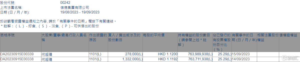 格隆汇9月19日丨根据联交所最新权益披露资料显示,2023年9月14日-9月15日,信德集团(00242.HK)获执行董事何超琼在场内以每股均价1.1192-1.12港元增持161万股,涉资约180万港元。