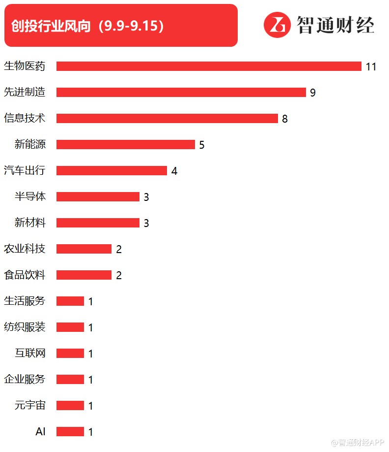 据智通财经统计,本周创投事件合计53起,较上周增长29%。从赛道上看,生物医药、先进制造、信息技术领域热度领先,周内融资项目分别达11个、9个、8个。从融资轮次上看,周内天使轮、A/A+轮融资项目数量最多,分别达14个、13个。