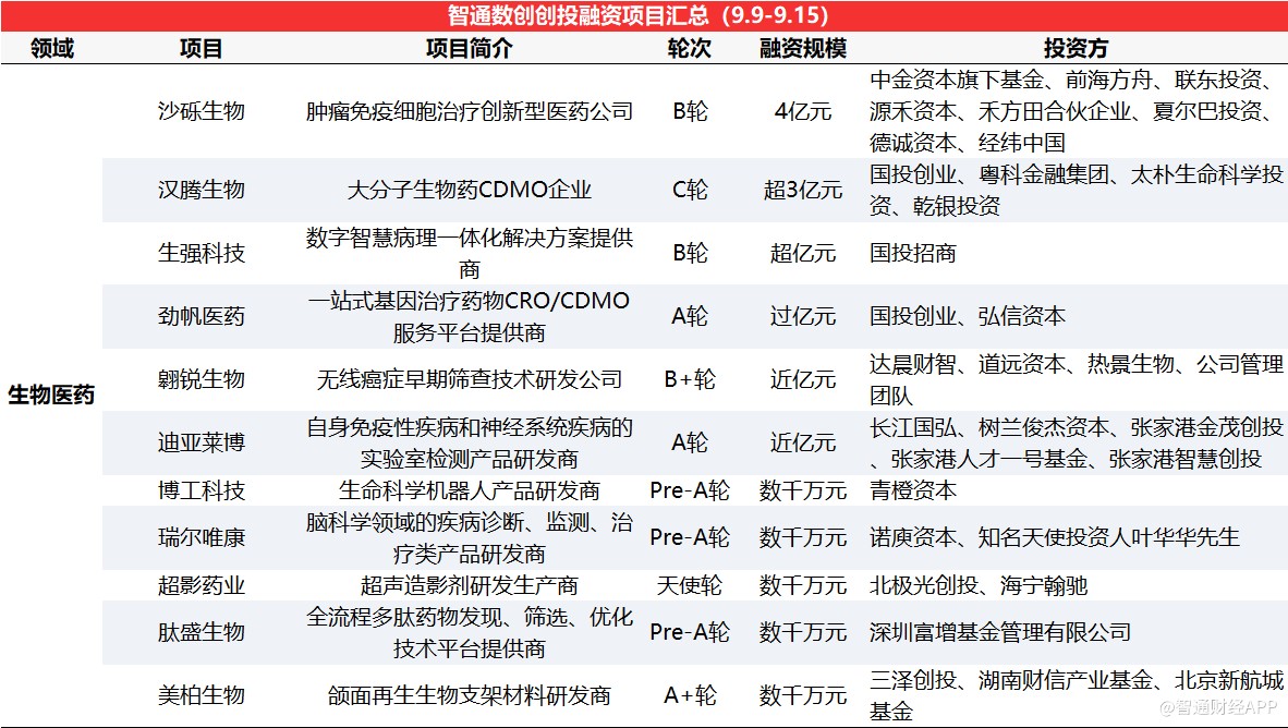 大健康领域,6个项目获亿元级融资。周内,肿瘤免疫细胞治疗创新型医药公司沙砾生物、大分子生物药CDMO企业汉腾生物等6家公司获亿元级融资,生命科学机器人产品研发商博工科技、超声造影剂研发生产商超影药业等5家公司获数千万元融资。