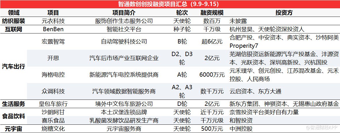 泛消费领域,汽车出行、生活服务领域现亿元级融资。周内,自动驾驶科技公司宏景智驾、汽车后市场产业互联网企业开思、境外中文包车旅游公司皇包车旅行获数亿元融资,新能源汽车电控系统提供商海格电控、汽车领域数据智能服务商众调科技获数千万元融资。