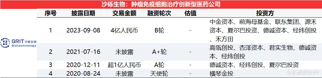 2、沙砾生物:据“沙砾生物”公众号报道,沙砾生物(Grit Biotechnology)宣布完成4亿元人民币的B轮融资,本轮融资由中金资本旗下基金领投,前海方舟、联东投资、源禾资本、禾方田合伙企业以及老股东夏尔巴投资、德诚资本、经纬中国跟投。本轮融资将用于支持公司肿瘤浸润淋巴细胞(TIL)疗法管线的开发,包括GT101的关键临床试验以及多项下一代基因编辑型TIL管线的开发,致力于为全球实体瘤患者打造开创性细胞药物。