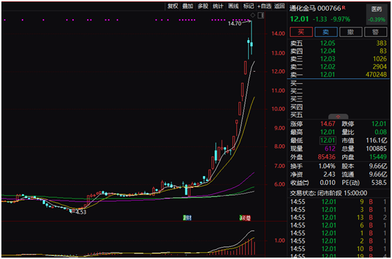 通化金马今天也跌停,此前在不到一个月的时间,公司股价翻了一倍多。