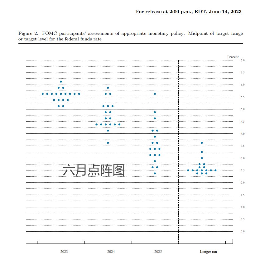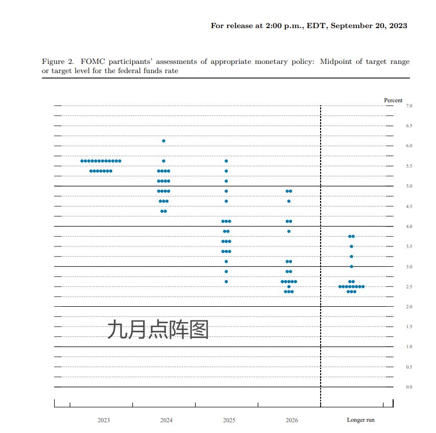 最新的点阵图预期中值显示:多数美联储委员继续保留年内还会有一次加息的预期,而2024年过半的利率点位已经跑到5%上方,也就是说9月点阵图对2024年降息的预期,与6月时相比少了一次。