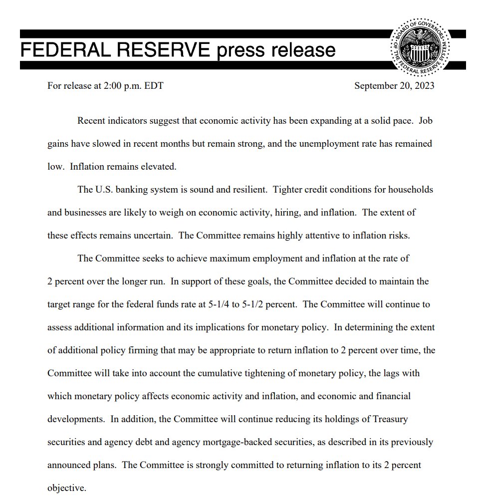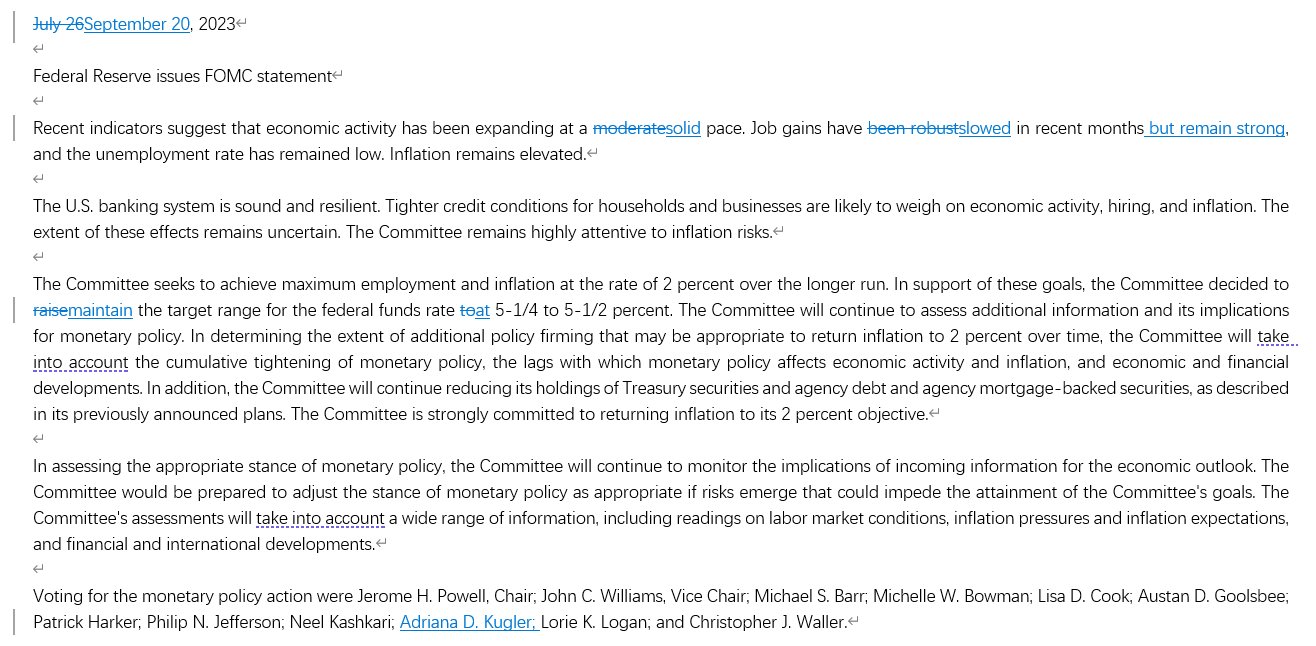 如市场所料,美联储在9月会议上没有调整政策利率,继续维持在5.25%-5.50%的位置。与7月FOMC文本措辞对比来看,两者之间的差别非常小。美联储把经济活动扩张的措辞从适度(Moderate)改成了坚固(Solid),同时美联储也把就业增长的措辞改成“有所放缓,但依然维持强劲”,今天的决议一共就这两点变化。