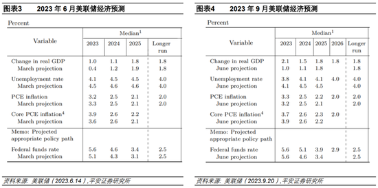 美联储2023年9月发布的经济预测(SEP),相较6月的主要变化包括:1)大幅上调2023年经济增长预期,由1.0%至2.1%;上修2024年经济增长预测,由1.1%至1.5%;2)下调2024、2025年失业率预期,由4.5%至4.1%;3)通胀预测变化不大。4)维持2023年利率预测为5.6%(即年内还有一次加息),同时上修2024、2025年利率预期50BP,分别至5.1%和3.9%。这些数据暗示,美联储对“软着陆”更有信心,进一步弱化了2024和2025年的衰退预期,继而认为美联储可以维持高利率更长时间。