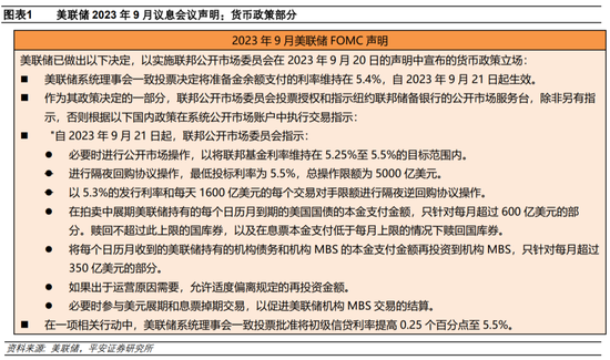 美联储2023年9月议息会议声明,维持联邦基金利率为5.25-5.5%目标区间,符合7月会议后的市场主流预期。同时,美联储维持其他政策利率:1)将存款准备金利率维持在5.4%;2)将隔夜回购利率维持在5.5%;3)将隔夜逆回购利率维持在5.3%;4)将一级信贷利率维持在5.5%。缩表方面,美联储将维持原有计划,每月被动缩减600亿美元国债和350亿美元机构债券和MBS。